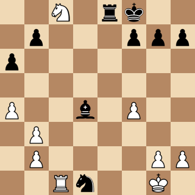Bohatirchuk, Fedor Parfenovich – Capablanca, Jose Raul ارسال شده توسط نویسنده اخبار شطرنج یار در اردیبهشت ۱۳, ۱۴۰۴ ۰ نظر (No content to display) Bohatirchuk, Fedor Parfenovich Capablanca, Jose Raul Result: 0-1 Metadata » Click to open. Date: 1925.??.?? Location: Moscow Tournament: Moscow Round: ? Opening: B83 Sicilian Scheveningen, 6.Be2 Submitted by: Published on: اردیبهشت ۱۳, ۱۴۰۴ Categories: بازی های کاپابلانکا [Event "Moscow"] [Site "Moscow"] [Date "1925.??.??"] [Round "?"] [White "Bohatirchuk, Fedor Parfenovich"] [Black "Capablanca, Jose Raul"] [Result "0-1"] [WhiteElo ""] [BlackElo ""] [ECO "B83"] 1.e4 c5 2.Nf3 Nc6 3.d4 cxd4 4.Nxd4 Nf6 5.Nc3 d6 6.Be2 e6 7.O-O Be7 8.Be3 O-O 9.f4 Bd7 10.Nb3 a6 11.a4 Na5 12.Qe1 Nxb3 13.cxb3 Bc6 14.Bf3 Qc7 15.Rc1 Rac8 16.Qg3 Qa5 17.Rfd1 d5 18.exd5 Bxd5 19.Bxd5 exd5 20.Bd4 Bc5 21.Qf2 Ng4 22.Qd2 Rfe8 23.Kh1 Qb4 24.Nxd5 Qxd4 25.Ne7+ Kf8 26.Qxd4 Bxd4 27.Nxc8 Nf2+ 28.Kg1 Nxd1+ 0-1 [Event "Moscow"] [Site "Moscow"] [Date "1925.??.??"] [Round "?"] [White "Bohatirchuk, Fedor Parfenovich"] [Black "Capablanca, Jose Raul"] [Result "0-1"] [WhiteElo ""] [BlackElo ""] [ECO "B83"] 1.e4 c5 2.Nf3 Nc6 3.d4 cxd4 4.Nxd4 Nf6 5.Nc3 d6 6.Be2 e6 7.O-O Be7 8.Be3 O-O 9.f4 Bd7 10.Nb3 a6 11.a4 Na5 12.Qe1 Nxb3 13.cxb3 Bc6 14.Bf3 Qc7 15.Rc1 Rac8 16.Qg3 Qa5 17.Rfd1 d5 18.exd5 Bxd5 19.Bxd5 exd5 20.Bd4 Bc5 21.Qf2 Ng4 22.Qd2 Rfe8 23.Kh1 Qb4 24.Nxd5 Qxd4 25.Ne7+ Kf8 26.Qxd4 Bxd4 27.Nxc8 Nf2+ 28.Kg1 Nxd1+ 0-1 White to move: find the best move... click the ? for the solution Black to move: find the best move... click the ? for the solution Warning: This game can only be seen if JavaScript is enabled in your browser.