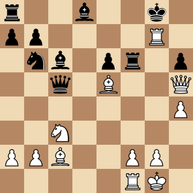 Botvinnik, Mikhail – Budo, A. ارسال شده توسط نویسنده اخبار شطرنج یار در اردیبهشت ۱۳, ۱۴۰۴ ۰ نظر (No content to display) Botvinnik, Mikhail Budo, A. Result: 1-0 Metadata » Click to open. Date: 1938.??.?? Location: Leningrad Tournament: URS-ch sf Round: ? Opening: D26 Queen's Gambit Accepted, Classical Variation Submitted by: Published on: اردیبهشت ۱۳, ۱۴۰۴ Categories: بازی های میخائیل باتوینیک [Event "URS-ch sf"] [Site "Leningrad"] [Date "1938.??.??"] [Round "?"] [White "Botvinnik, Mikhail"] [Black "Budo, A."] [Result "1-0"] [WhiteElo ""] [BlackElo ""] [ECO "D26"] 1.e4 c6 2.d4 d5 3.exd5 cxd5 4.c4 Nf6 5.Nc3 e6 6.Nf3 Be7 7.Bg5 dxc4 8.Bxc4 O-O 9.O-O Nbd7 10.Qe2 Nb6 11.Bb3 Bd7 12.Rad1 Bc6 13.Ne5 Bd5 14.Bc2 Nfd7 15.Bf4 Nxe5 16.dxe5 Bg5 17.Qh5 h6 18.Bg3 Qc7 19.h4 Bd8 20.Rd4 Qc5 21.Rg4 f5 22.exf6 Rxf6 23.Be5 Bc6 24.Rxg7+ 1-0 [Event "URS-ch sf"] [Site "Leningrad"] [Date "1938.??.??"] [Round "?"] [White "Botvinnik, Mikhail"] [Black "Budo, A."] [Result "1-0"] [WhiteElo ""] [BlackElo ""] [ECO "D26"] 1.e4 c6 2.d4 d5 3.exd5 cxd5 4.c4 Nf6 5.Nc3 e6 6.Nf3 Be7 7.Bg5 dxc4 8.Bxc4 O-O 9.O-O Nbd7 10.Qe2 Nb6 11.Bb3 Bd7 12.Rad1 Bc6 13.Ne5 Bd5 14.Bc2 Nfd7 15.Bf4 Nxe5 16.dxe5 Bg5 17.Qh5 h6 18.Bg3 Qc7 19.h4 Bd8 20.Rd4 Qc5 21.Rg4 f5 22.exf6 Rxf6 23.Be5 Bc6 24.Rxg7+ 1-0 White to move: find the best move... click the ? for the solution Black to move: find the best move... click the ? for the solution Warning: This game can only be seen if JavaScript is enabled in your browser.
