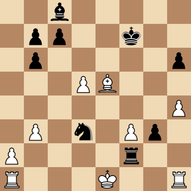 Corzo y Prinzipe, Juan – Capablanca, Jose Raul ارسال شده توسط نویسنده اخبار شطرنج یار در اردیبهشت ۱۳, ۱۴۰۴ ۰ نظر (No content to display) Corzo y Prinzipe, Juan Capablanca, Jose Raul Result: 0-1 Metadata » Click to open. Date: 1901.??.?? Location: Havana Tournament: Havana m Round: 8 Opening: C25 Vienna Game Submitted by: Published on: اردیبهشت ۱۳, ۱۴۰۴ Categories: بازی های کاپابلانکا [Event "Havana m"] [Site "Havana"] [Date "1901.??.??"] [Round "8"] [White "Corzo y Prinzipe, Juan"] [Black "Capablanca, Jose Raul"] [Result "0-1"] [WhiteElo ""] [BlackElo ""] [ECO "C25"] 1.e4 e5 2.Nc3 Nc6 3.f4 exf4 4.Nf3 g5 5.h4 g4 6.Ng5 h6 7.Nxf7 Kxf7 8.d4 d5 9.exd5 Qe7+ 10.Kf2 g3+ 11.Kg1 Nxd4 12.Qxd4 Qc5 13.Ne2 Qb6 14.Qxb6 axb6 15.Nd4 Bc5 16.c3 Ra4 17.Be2 Bxd4+ 18.cxd4 Rxd4 19.b3 Nf6 20.Bb2 Rd2 21.Bh5+ Nxh5 22.Bxh8 f3 23.gxf3 Nf4 24.Be5 Rg2+ 25.Kf1 Rf2+ 26.Ke1 Nd3+ 0-1 [Event "Havana m"] [Site "Havana"] [Date "1901.??.??"] [Round "8"] [White "Corzo y Prinzipe, Juan"] [Black "Capablanca, Jose Raul"] [Result "0-1"] [WhiteElo ""] [BlackElo ""] [ECO "C25"] 1.e4 e5 2.Nc3 Nc6 3.f4 exf4 4.Nf3 g5 5.h4 g4 6.Ng5 h6 7.Nxf7 Kxf7 8.d4 d5 9.exd5 Qe7+ 10.Kf2 g3+ 11.Kg1 Nxd4 12.Qxd4 Qc5 13.Ne2 Qb6 14.Qxb6 axb6 15.Nd4 Bc5 16.c3 Ra4 17.Be2 Bxd4+ 18.cxd4 Rxd4 19.b3 Nf6 20.Bb2 Rd2 21.Bh5+ Nxh5 22.Bxh8 f3 23.gxf3 Nf4 24.Be5 Rg2+ 25.Kf1 Rf2+ 26.Ke1 Nd3+ 0-1 White to move: find the best move... click the ? for the solution Black to move: find the best move... click the ? for the solution Warning: This game can only be seen if JavaScript is enabled in your browser.