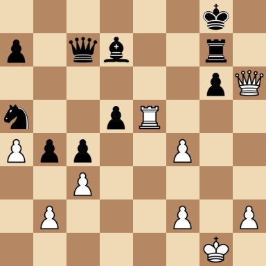 Tinsley, Samuel – Steinitz, William ارسال شده توسط نویسنده اخبار شطرنج یار در اردیبهشت ۱۶, ۱۴۰۴ ۰ نظر (No content to display) Tinsley, Samuel Steinitz, William Result: 0-1 Metadata » Click to open. Date: 1899.??.?? Location: London Tournament: London Round: 5 Opening: D00 Queen's Pawn Game (including Blackmar–Diemer Gambit, Halosar Trap and others) Submitted by: Published on: اردیبهشت ۱۶, ۱۴۰۴ Categories: بازی های ویلهلم اشتاینیتز [Event "London"] [Site "London"] [Date "1899.??.??"] [Round "5"] [White "Tinsley, Samuel"] [Black "Steinitz, William"] [Result "0-1"] [WhiteElo ""] [BlackElo ""] [ECO "D00"] 1.d4 d5 2.e3 e6 3.Nd2 c5 4.Nb3 c4 5.Nd2 b5 6.c3 Nf6 7.a4 b4 8.g3 Nc6 9.Bg2 Bd7 10.Ne2 Rb8 11.O-O Be7 12.e4 O-O 13.Re1 Na5 14.Nf4 dxe4 15.Qe2 Qc7 16.Nh5 Nxh5 17.Qxh5 f5 18.Nxe4 g6 19.Qh6 fxe4 20.Bxe4 Rf7 21.Bf4 Bd6 22.Bxg6 hxg6 23.Re5 Rg7 24.Rae1 Rf8 25.d5 Rxf4 26.gxf4 Bxe5 27.Rxe5 exd5 0-1 [Event "London"] [Site "London"] [Date "1899.??.??"] [Round "5"] [White "Tinsley, Samuel"] [Black "Steinitz, William"] [Result "0-1"] [WhiteElo ""] [BlackElo ""] [ECO "D00"] 1.d4 d5 2.e3 e6 3.Nd2 c5 4.Nb3 c4 5.Nd2 b5 6.c3 Nf6 7.a4 b4 8.g3 Nc6 9.Bg2 Bd7 10.Ne2 Rb8 11.O-O Be7 12.e4 O-O 13.Re1 Na5 14.Nf4 dxe4 15.Qe2 Qc7 16.Nh5 Nxh5 17.Qxh5 f5 18.Nxe4 g6 19.Qh6 fxe4 20.Bxe4 Rf7 21.Bf4 Bd6 22.Bxg6 hxg6 23.Re5 Rg7 24.Rae1 Rf8 25.d5 Rxf4 26.gxf4 Bxe5 27.Rxe5 exd5 0-1 White to move: find the best move... click the ? for the solution Black to move: find the best move... click the ? for the solution Warning: This game can only be seen if JavaScript is enabled in your browser.